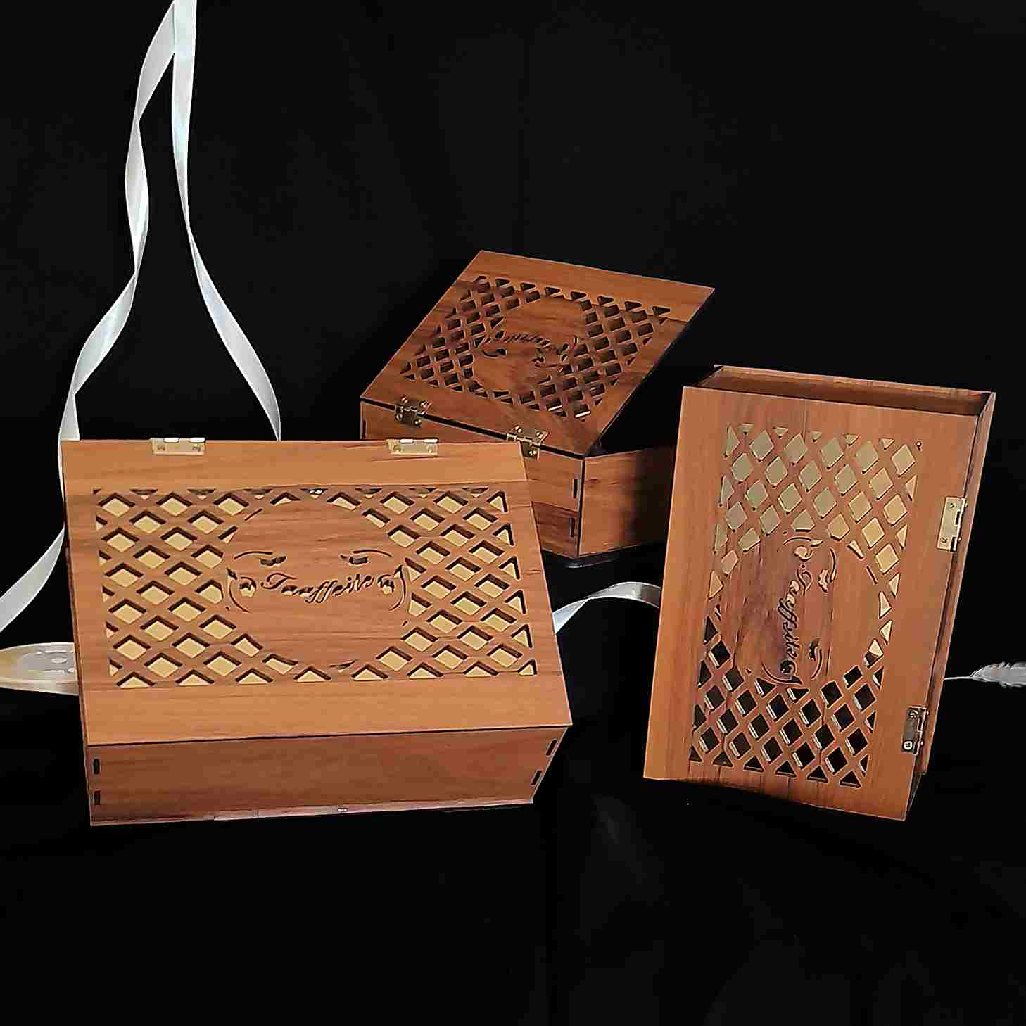 باکس چوبی مقاوم  با برش لیزری دارای لولای فلزی و آینه نشکن که جذابیت این محصول را دو چندان کرده